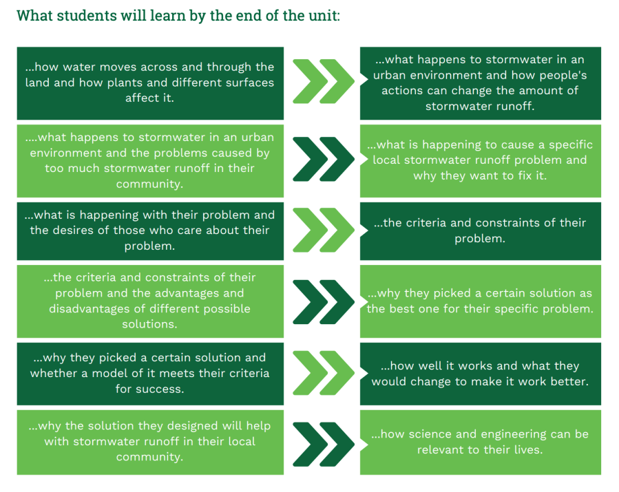 Over the course of the unit, students use science and engineering to understand and develop a solution for a real world stormwater runoff problem in their community. They use experiments and field investigations to build on their understanding of why stormwater can cause flooding in an urban setting. Then they use an Engineering Design Process to come up with a proposal towards solving a specific local stormwater problem.